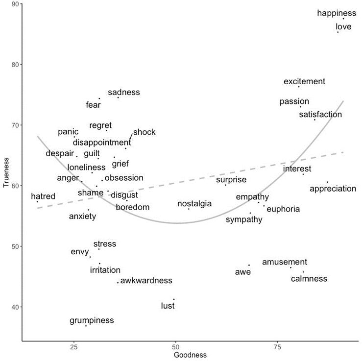 该研究小组询问了395名美国参与者:如果把“真实”一词与孤独、悲伤、迷恋、愤怒、欲望、敬畏、平静、欣快、欣赏、怀旧、绝望等情感搭配在一起,是奇怪还是自然?此外,研究人员还要求参与者们评定这些情绪是好是坏,或者说,各种情绪会让一个人的生活变得更好,还是更糟。