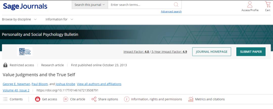 Newman, G. E., Bloom, P., & Knobe, J. (2014). Value Judgments and the True Self. Personality and Social Psychology Bulletin, 40(2), 203–216.https://doi.org/10.1177/0146167213508791