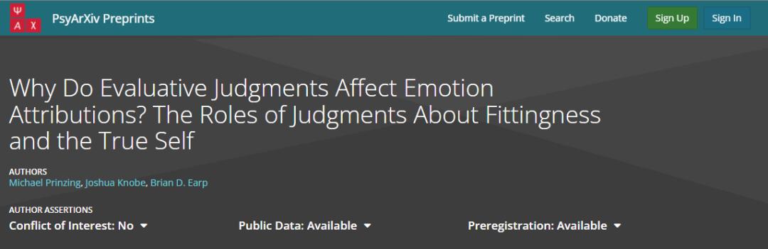 Prinzing, Michael, et al. “Why Do Evaluative Judgments Affect Emotion Attributions? the Roles of Judgments About Fittingness and the True Self.” PsyArXiv, 25 Nov. 2022. Web.10.31234/osf.io/5dkp3