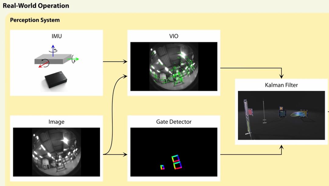 在该研究中,Swift 系统通过将 AI 学习技术与传统工程算法融合,实现了智能训练。首先,该系统通过人工神经网络处理无人机从相机中获取的图像,从而精准地检测到门的角落。然后,利用双目视觉软件用来计算无人机的速度。