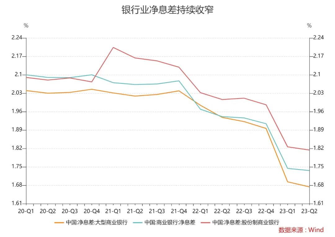 国家金融监督管理总局发布的数据显示,上半年商业银行净息差为1.74%,与一季度持平,其中大行、股份行净息差继续下行至1.67%、1.81%。值得注意的是,近期讨论热度颇高的存量房贷利率调降,也或将加剧银行业的息差压力。