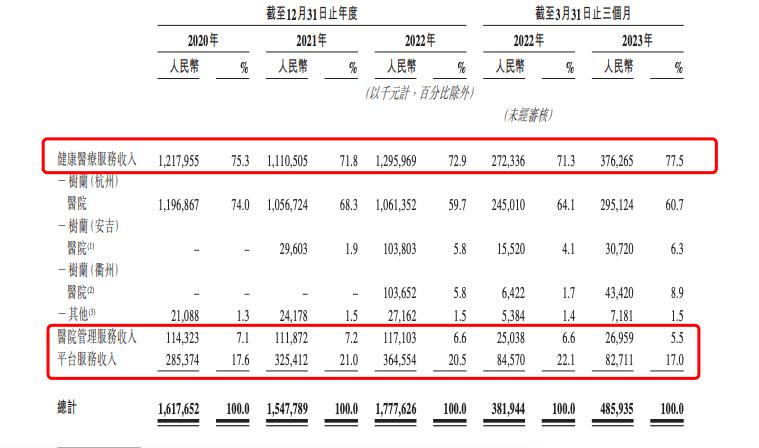 2020-2022年,树兰医疗的健康医疗服务产生的收入分别占总收入的75.3%、71.7%、72.9%,贡献了总收入的大部分。