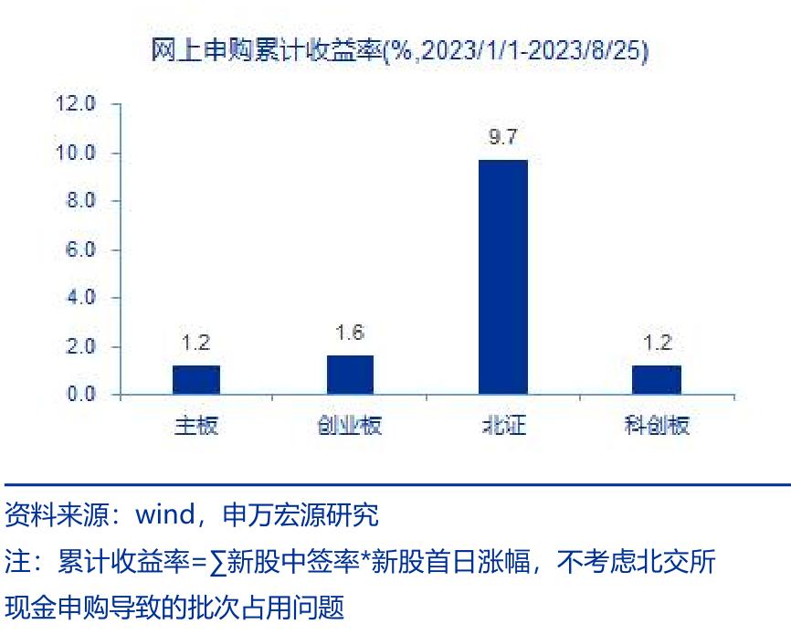 另外值得关注的是,从今年的打新数据直观来看,北交所的新股破发率与平均涨幅都差于沪深。但实际上,由于北交所的网上申购中签率较高,北交所今年新股网上申购累计收益率远高于沪深。