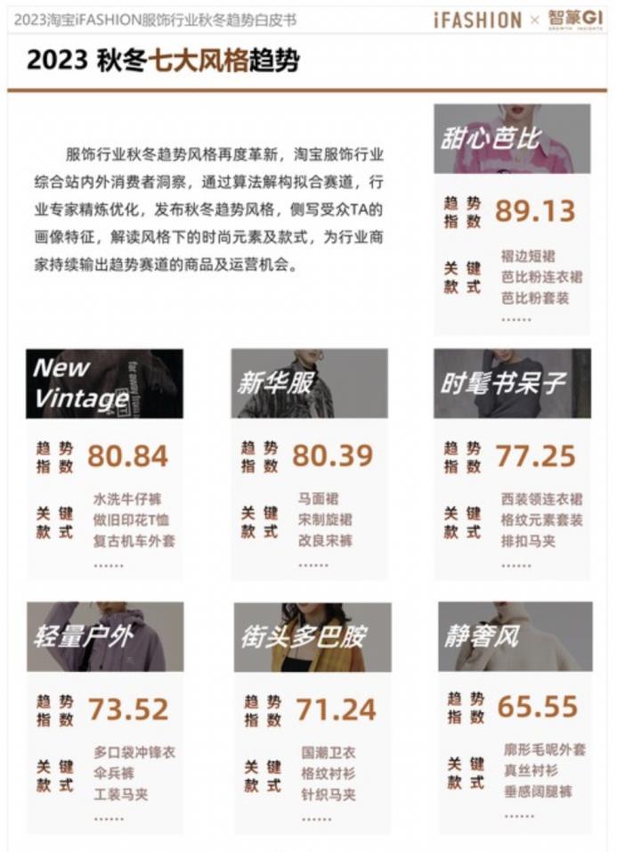 而在Supreme和Vans销量下滑的2022-2023年,同属于母公司威富集团的户外品牌The North Face收入则在不断增长,成为了威富集团的亮点品牌,这也印证了潮流趋势的变化。近日,淘宝发布的《淘宝iFashion2023服饰行业秋冬趋势白皮书》提到的2023秋冬七大风格趋势中,轻量户外位列第五。潮流趋势变化飞快,排名第一的甜心芭比风格几乎完全由电影《芭比》带火,很少有哪个风格能够长青。