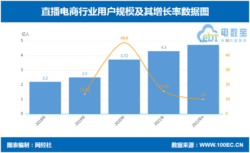 网经社电子商务研究中心发布的《2022年度中国直播电商市场数据报告》显示,2022年直播电商用户规模达到4.73亿人,同比增长10%,增速出现下滑。2018-2021年直播电商的用户规模分别为2.2亿人、2.5亿人、3.72亿人、4.3亿人,2020年用户规模增速达到顶峰,为48.8%,而后两年增速逐渐放缓。