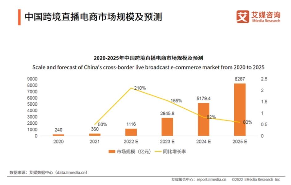 艾媒咨询数据则显示,2023年,中国跨境直播电商市场预计规模为2845.8亿元,同比增长率高达155%,2025年市场规模将达到8287亿元。