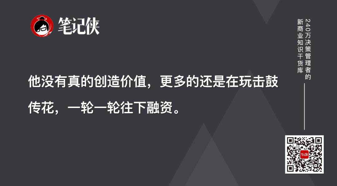 他没有真的创造价值,更多的还是在玩击鼓传花,一轮一轮往下融资。