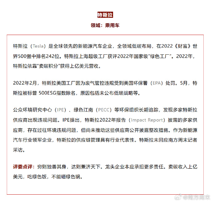 特斯拉一边宣传全领域低碳布局,一边又因废气管控违规收到美国环保署处罚,还曾因为未公布低碳战略而被标普500ESG指数除名。