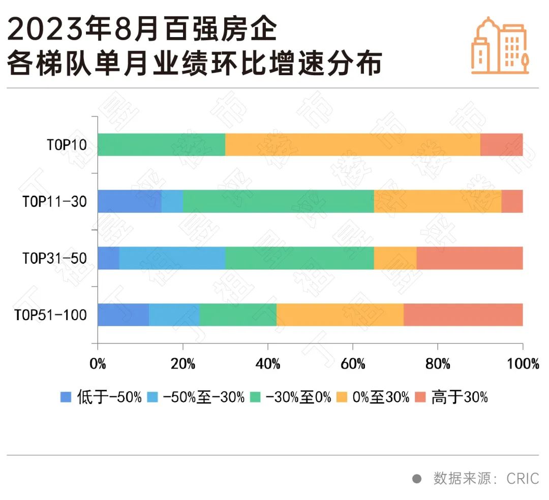 具体来看,8月有22家百强房企的单月业绩环比降幅大于30%,其中有10家百强房企业绩环比降幅超50%,另有28家百强房企业绩环比降幅在0-30%之间。