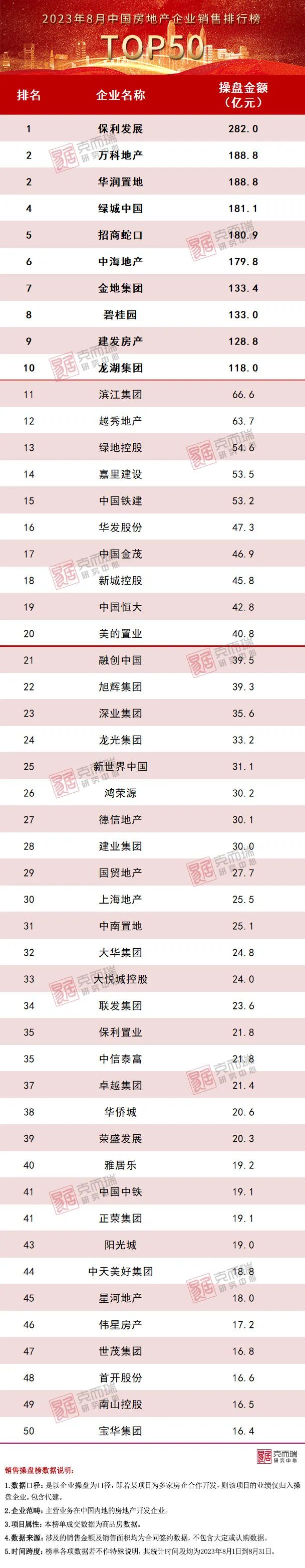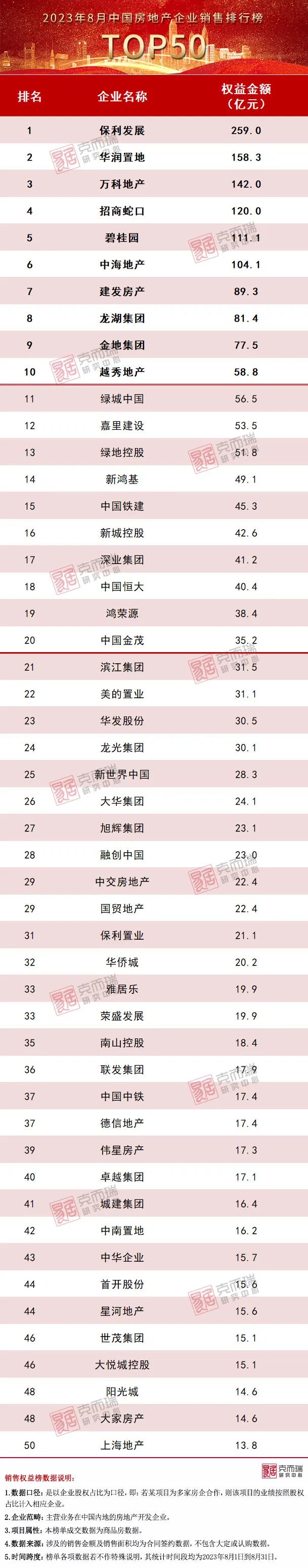 附:2023年8月中国房地产企业销售排行榜TOP50