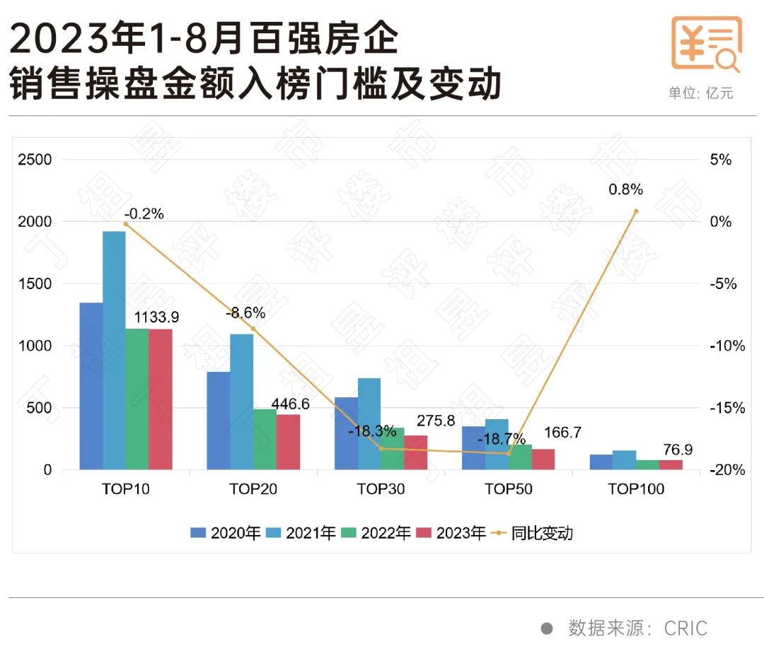 从不同梯队房企销售门槛值的变化来看,2023年1-8月TOP10房企的销售操盘金额门槛为1133.9亿元,同比微降0.2%,TOP20门槛降低8.6%至446.6亿元。