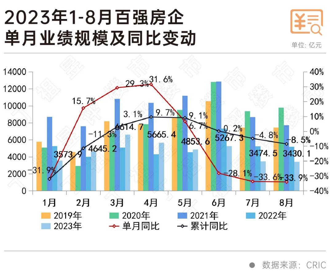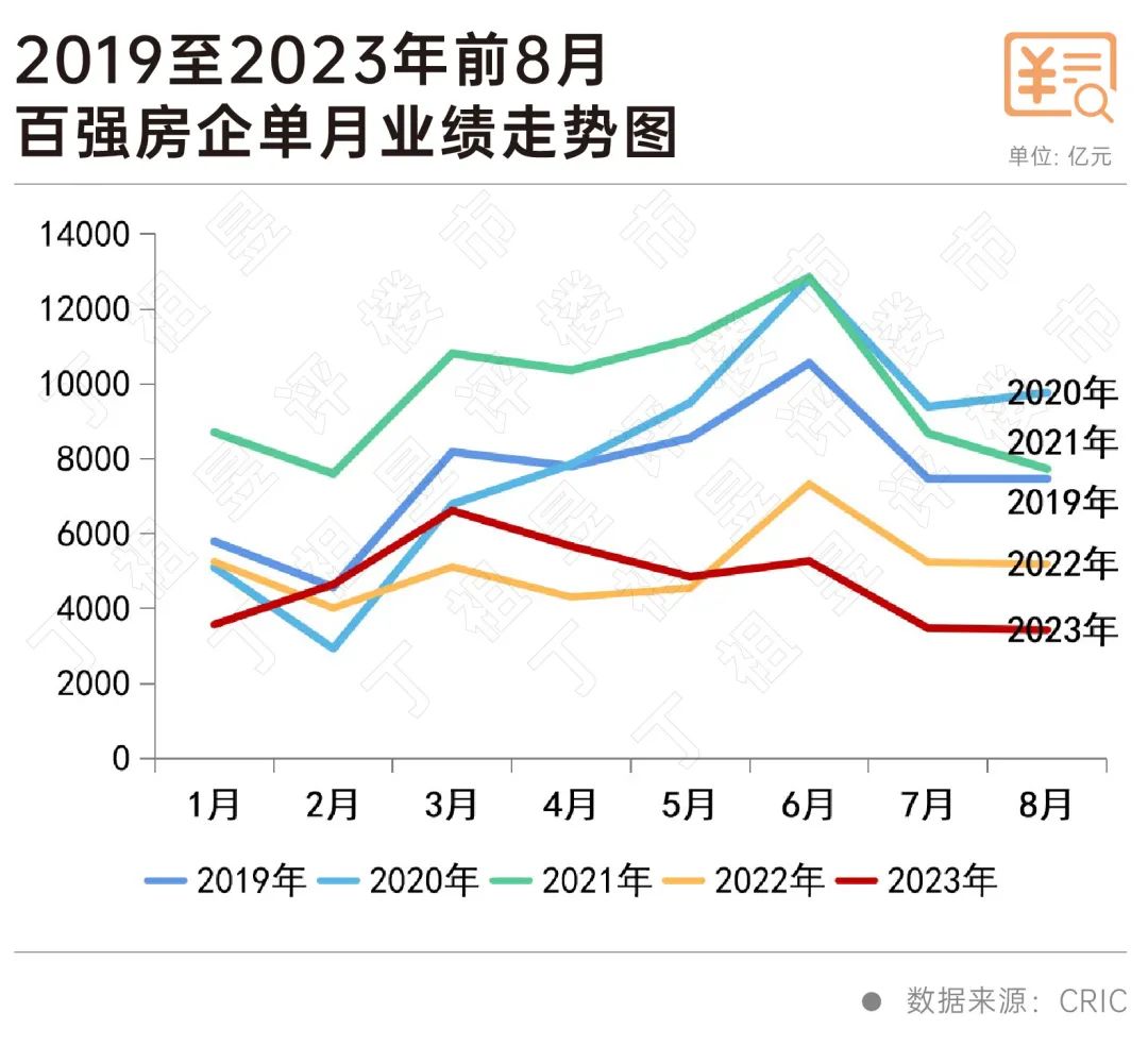 对比近五年百强房企单月业绩走势,可以明显看出,2023年8月单月业绩规模已处于历年同期的最低水平,且已连续3个月处于近五年同期低位。
