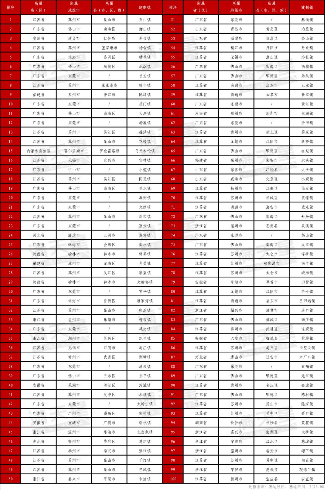 然而,不久前由赛迪顾问和赛迪四川联合发布的“2023镇域经济500强”,展现出广东镇域经济的另一面:其根据2021年数据评选的2023年500强镇中,广东共有81席,不敌江苏137席、浙江86席;而范围进一步收窄至“百强镇”,广东的33席也低于江苏的37席。