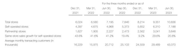 其中,二季度净新开门店1485家,总门店数量环比增长15.9%。截至二季度末,门店总数达10836家,其中自营门店7188家,联营门店3648家。
