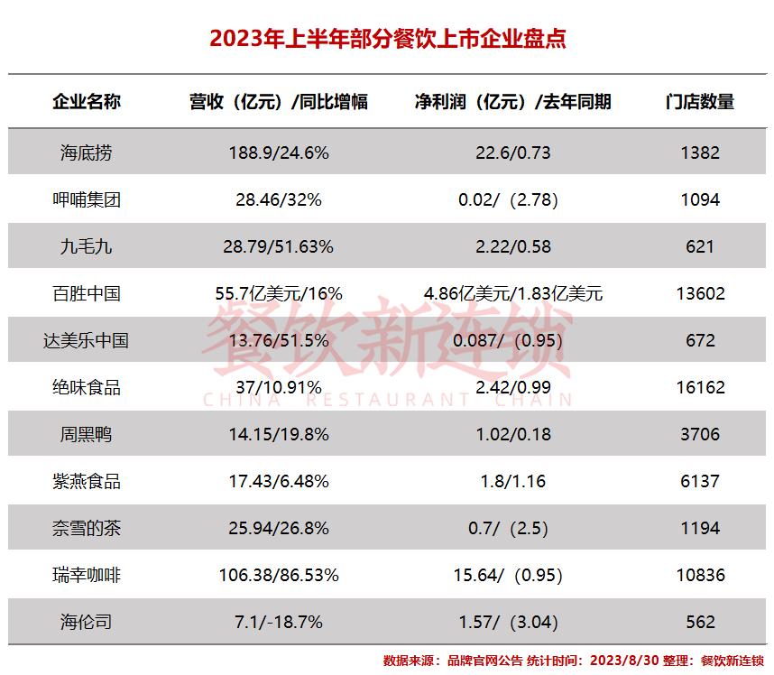 包括海底捞、呷哺集团、九毛九、达美乐中国、百胜中国、绝味食品、周黑鸭、紫燕食品、奈雪的茶、瑞幸咖啡、海伦司在内的11家细分头部餐企,在报告期内全部达成正向盈利,其中海底捞、瑞幸完成巨幅增长。