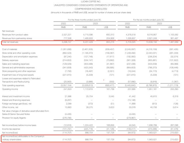 ■ 瑞幸咖啡2023年二季度及上半年财务数据