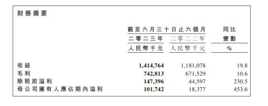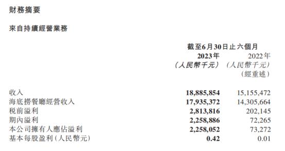 8月30日,海底捞发布了2023年中期业绩报告,报告期内海底捞多项经营数据同比大幅提升,取得营业收入188.9亿元人民币,较去年同期持续经营业务收入增长24.6%;净利润22.6亿元,创上半年业绩新高,接近2019年全年净利润。