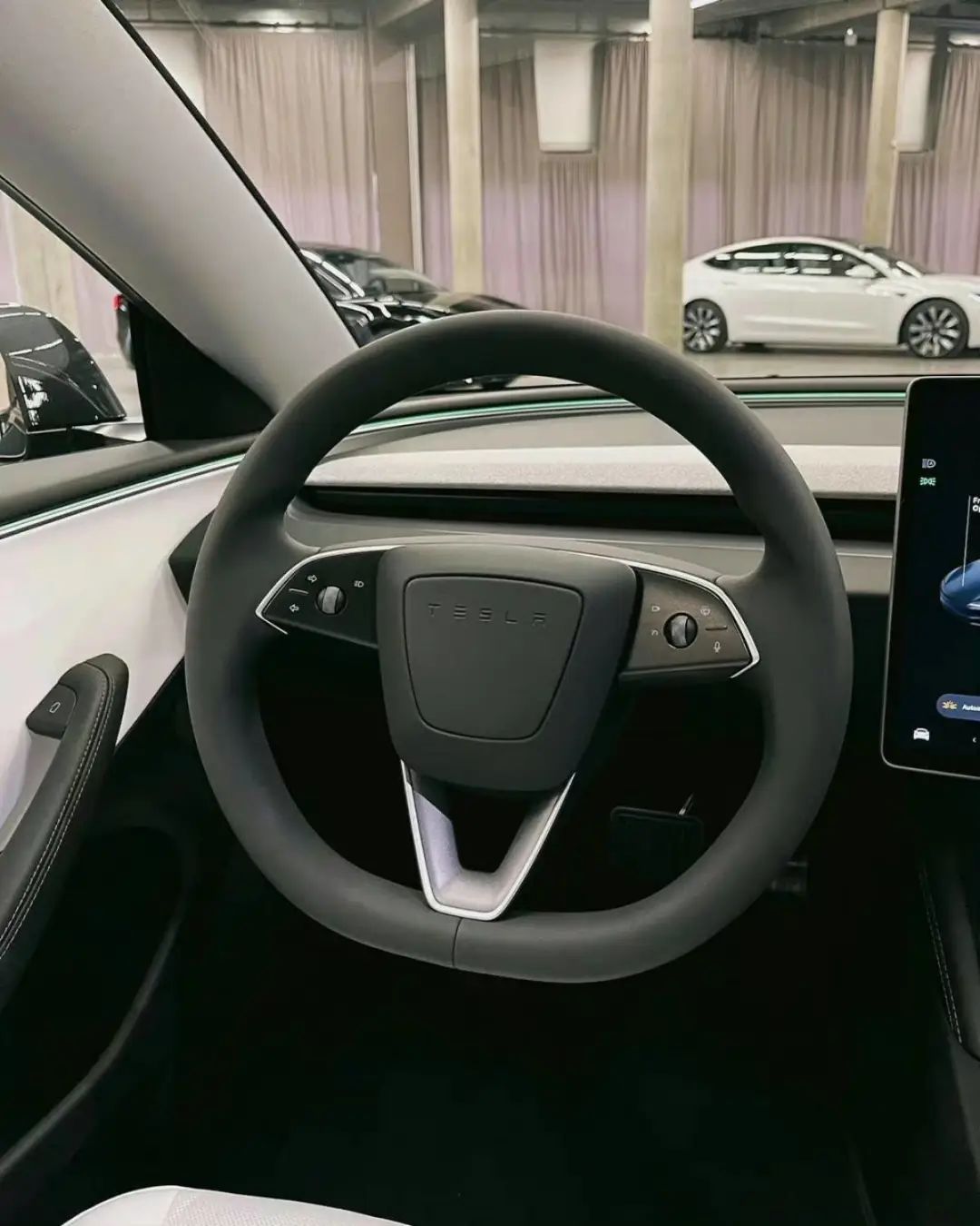 现在把目光看向另外一边,特斯拉将方向灯拨杆也去掉了,转向灯、喇叭等按钮被集成到了方向盘上,以压感按钮的方式存在。另外,方向盘的样式也发生了改变,新款 Model 3 采用了之前 Cybertruck 被曝光的同款方向盘。