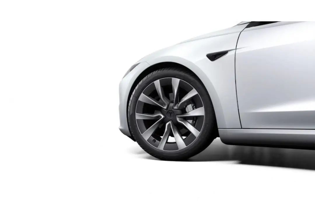 来到侧面,你会发现唯一的区别在于轮毂。新款 Model 3 提供两款轮毂样式选择,一款是标配的 18 英寸光子轮毂;另一款则是需要额外 6000 元人民币选购的 19 英寸新星轮毂。