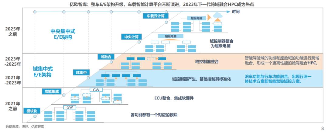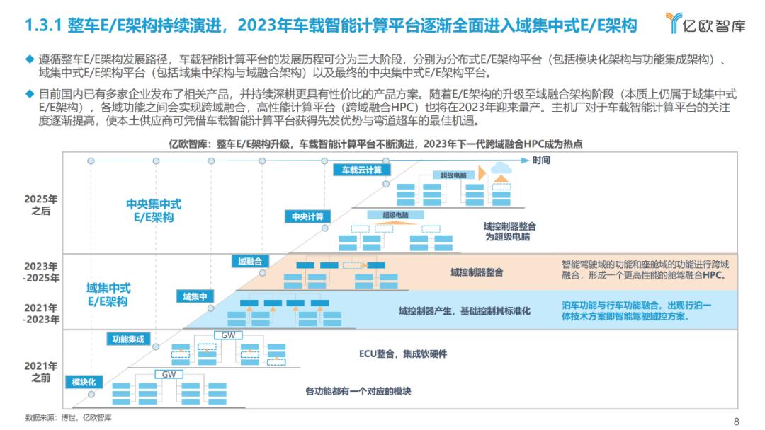 整车E/E架构持续演进,2023年车载智能计算平台逐渐全面进入域集中式E/E架构