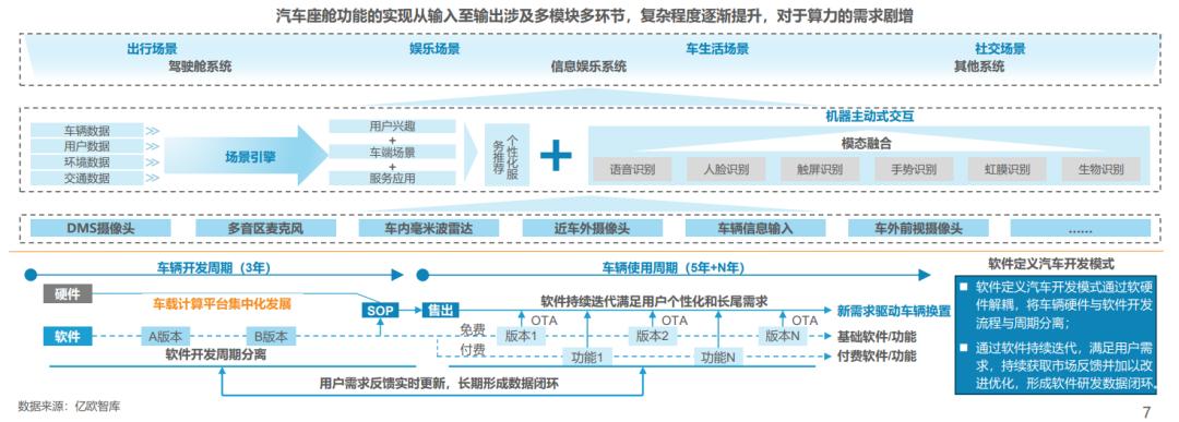 传统功能汽车采用分布式电子电气架构,离散化的ECU软硬件紧耦合且各ECU之间独立性较强,硬件资源无法共享且形成数据孤岛,对用户新需求反馈的整体周期长达20个月以上,难以形成持续快速迭代的软件开发模式。软件定义汽车开发模式可以通过硬件预埋,软件持续优化升级的方式实现用户体验提升,其核心是车载计算的集中化发展,高集成化的域控制器、HPC成为关键。