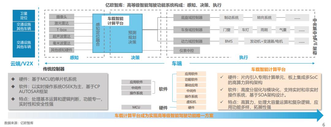 硬件层,汽车传统ECU主要采用MCU实现简单的计算和逻辑判断。智能计算平台通常使用单个甚至多个集成CPU、GPU、FPGA或AISC的SoC,可实现大量数据并行计算和复杂的逻辑功能。软件层,传统ECU软件架构较为简单,部分功能简单的控制器甚至不需要使用操作系统和中间件。车载智能计算平台软件架构更复杂,自下而上包括虚拟机、操作系统、中间件、功能软件和应用软件。