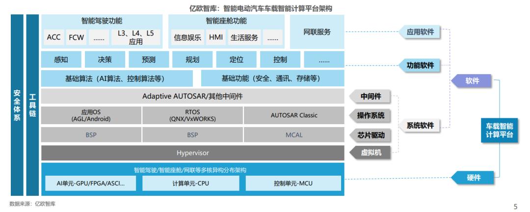车载智能计算平台分为软硬件架构,主控芯片+3层软件适配实现功能应用