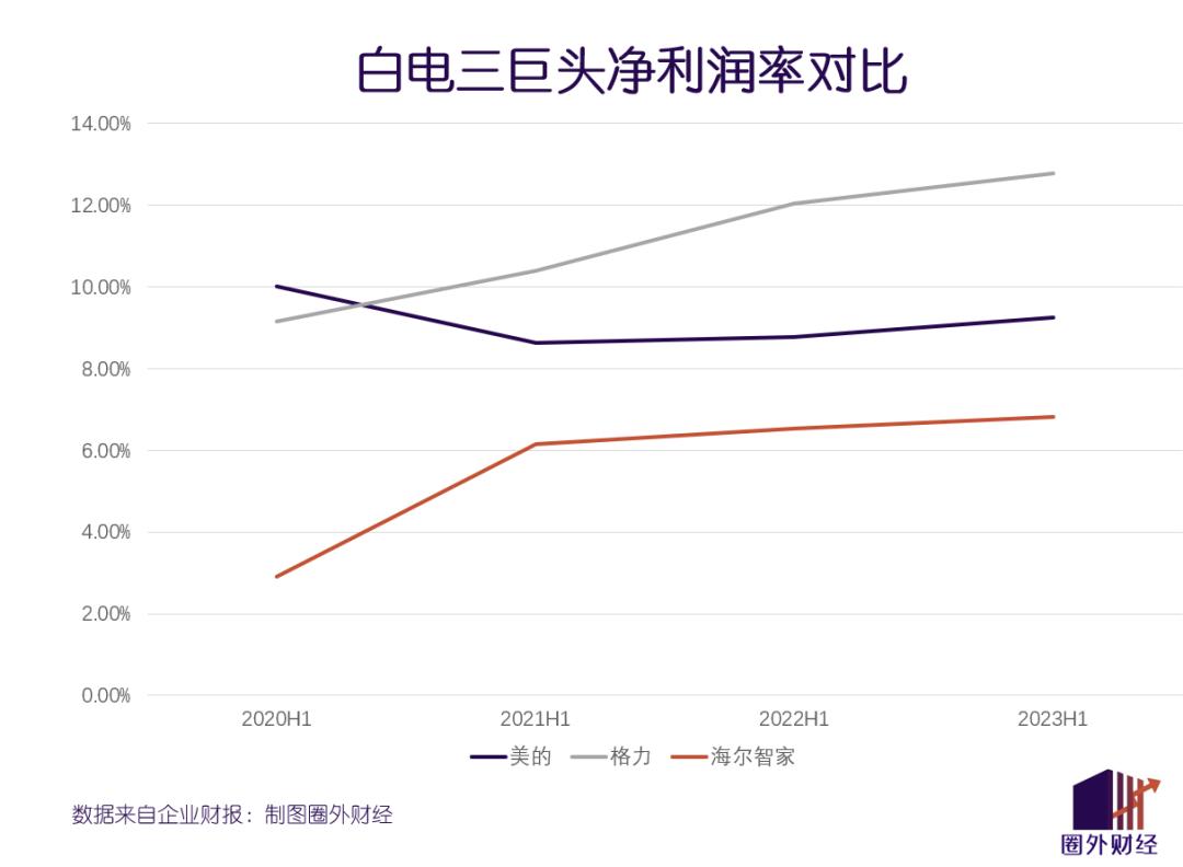 美的二季度净利润为182.32亿元,同比增长13.98%,净利润率录得9.26%,基本每股收益、扣非后净利润也分别同比增长14.1%和12.49%;格力上半年净利润则录得126.73亿元,同比增长10.52%,最亮眼的是高达12.77%的净利润率;海尔智家净利润为89.64亿元,同比增长12.77%,净利润率则录得6.81%。