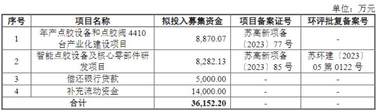 本次募集资金拟用于年产点胶设备和点胶阀4410台产业化建设项目、智能点胶设备及核心零部件研发项目、偿还银行贷款和补充流动资金。其中拟投资8870.07万元用于年产点胶设备和点胶阀4410台产业化建设项目,此项目建成后可实现年产各类阀体和自动化整机设备4410台(套)的生产能力。拟投资8282.13万元用于智能点胶设备及核心零部件研发项目,对新能源汽车、半导体、机器人等其他应用领域根据市场发展趋势进行前瞻性研究和设计,增强综合技术研发实力和市场竞争力。