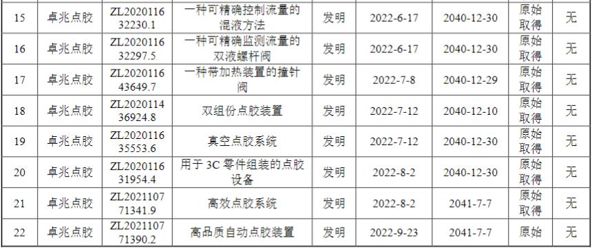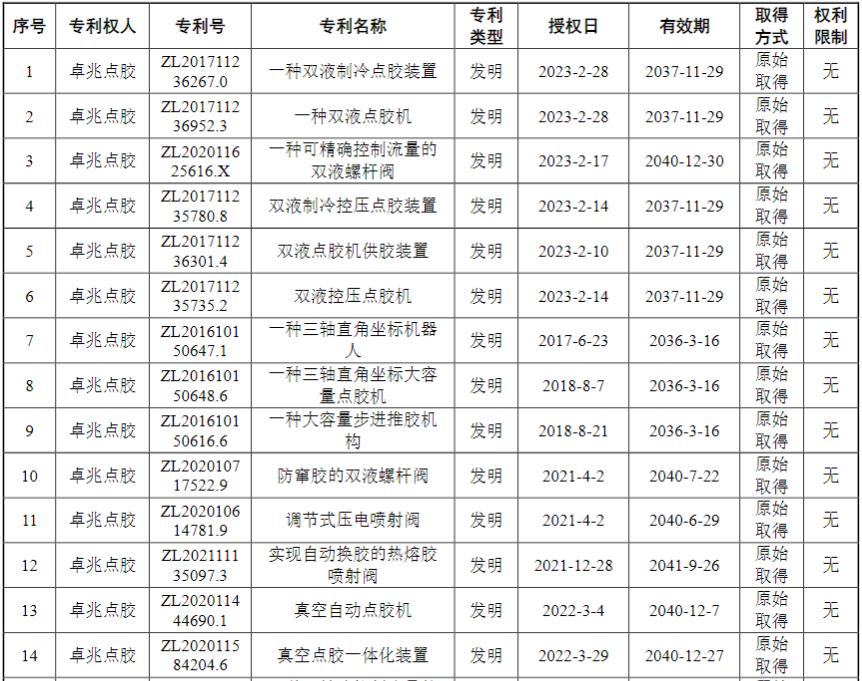 截止目前,卓兆点胶共拥有30项发明专利、141项实用新型专利、10项外观设计专利,并拥有软件著作权9项;通过对点胶阀体及其核心部件的设计开发、运动控制算法、整机结构设计的深耕钻研,形成了多项核心技术,广泛应用于公司主要产品及服务中。