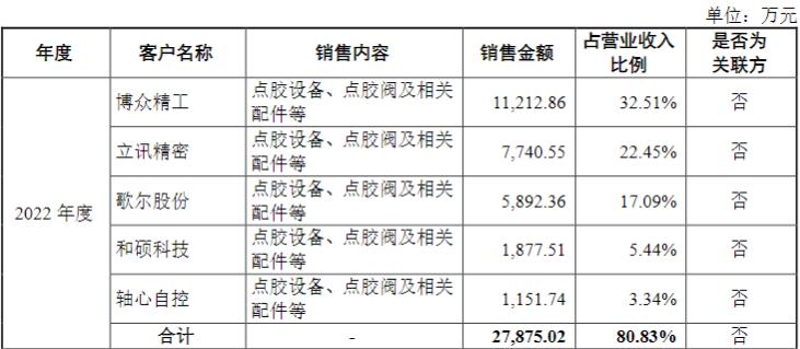 客户方面,2020-2022年卓兆点胶前五大客户占总营收比例为85.38%、81.42%、80.83%,均在80%以上;且三年间公司向全球头部消费电子产业客户苹果公司及其EMS厂商、设备集成商的销售收入占当期营收的比例分别为86.85%、91.06%及88.13%,平均在90%左右。公司客户集中度较高,对苹果产业链有一定的依赖。此外,公司已成功切入比亚迪、特斯拉等知名新能源汽车制造商、隆基绿能等光伏组件制造生产商及零部件供应商的供应链体系。