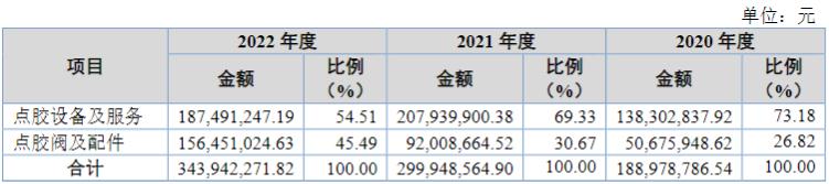 从营收结构来看,点胶设备及服务是卓兆点胶的主要收入来源,2022年点胶设备的营收较2020年增长了35.57%;同时,点胶阀及配件的营收占比也迅速增长,从2020年的26.82%上涨到2022年的45.49%,上涨了18.67个百分点。