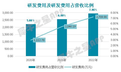 研发费用方面,2020-2022年的研发费用分别为1112.78万元、2046.19万元、2709.90万元,2022年研发费用相比2020年增长143.53%,占营收比例分别为5.88%、6.80%、7.86%,研发费用及占比逐年增长,研发投入力度逐渐加大。