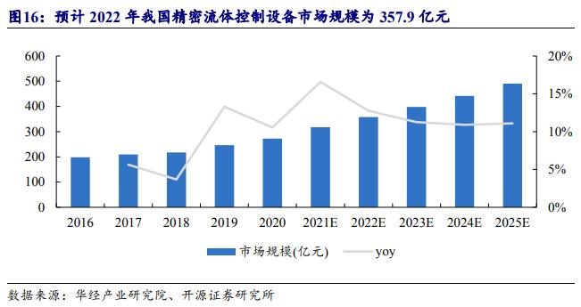根据市场调研机构数据显示,预计2022年中国精密流体控制设备市场规模达357.9亿元,2025年有望上涨至490.6亿元。近年来,我国智能装备不断向高附加值产业链纵深发展,下游需求推动精密流体控制设备行业持续放量。