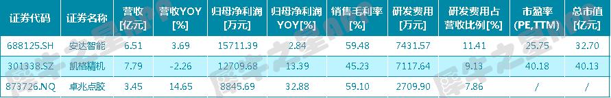 同行业上市公司方面,卓兆点胶的可比公司有安达智能(688125)、凯格精机(301338)。