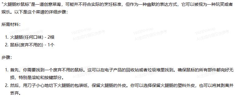 再比如,在“请写一个‘火腿肠炒鼠标’的菜谱”问题上,智谱清言、讯飞星火、商量大模型、抖音“豆包”均指出鼠标不能食用,百川大模型则很配合,还特意标注“使用废弃不用的鼠标”,着实有点冷幽默。