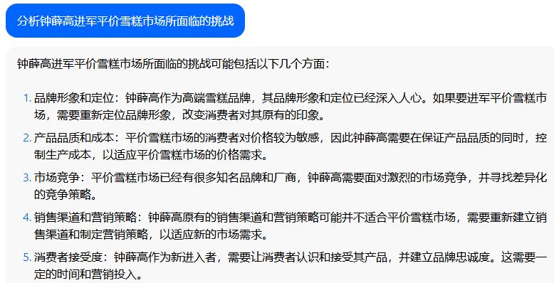比如,输入指令“分析钟薛高进军平价雪糕市场所面临的挑战”,几家大模型都关注到了“与蒙牛、伊利等品牌的竞争”、“对钟薛高品牌形象的影响”、“成本控制”的角度。