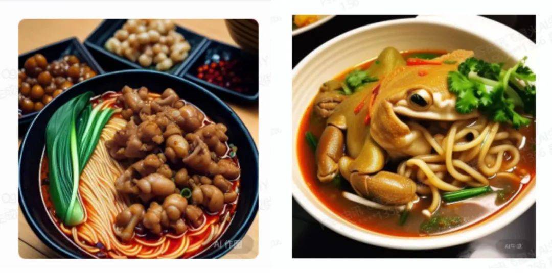 比如,“画一碗牛蛙面”,讯飞星火的很离谱——面里有整只牛蛙。