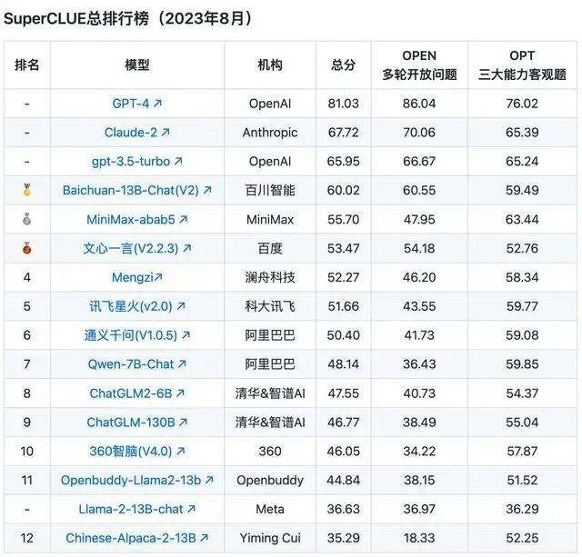 不过,国内大模型榜单SuperCLUE发布的大模型8月排行榜,倒是能体现出这些大模型的总体水平。排行榜显示,在国产大模型中,百川智能的Baichuan-13B-Chat(V2)拿下榜首,MiniMax的MiniMax-abab5及百度的文心一言(V2.2.3)紧随其后。