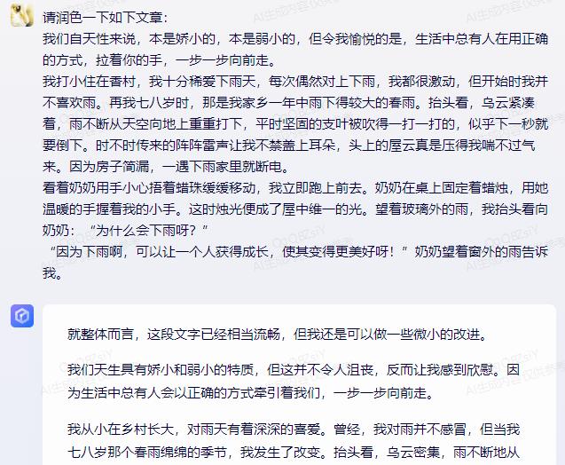 但这种处理风格并不固定,比如,对于“我打小住在乡村,我十分稀爱下雨天,每次偶然对上下雨,我都很激动”的润色,文心一言的处理更简洁“我从小在乡村长大,对雨天有着深深的喜爱”;讯飞星火则是在原有表达基础上做简单修饰“我自幼生活在乡村,我非常喜爱下雨天。每当偶然遇到下雨天,我总是兴奋不已。”——可见,AI算法带有强烈的“随机性”。
