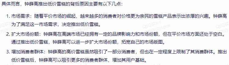 不过,瑕疵也在所难免,在“分析钟薛高推出低价雪糕的原因”问题上,几家大模型虽然都给出了3-4点分析角度,但其实有些角度的本质含义一样,均指向“扩大消费群体,开拓市场份额”,是可以合并的。