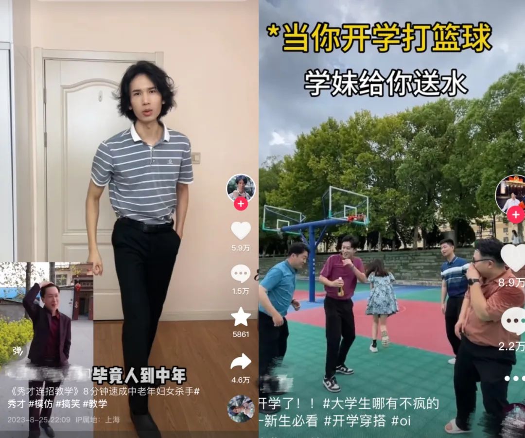 在B站和视频号上,00后男孩们以大学宿舍、篮球场为背景,拍摄视频《秀才宿舍》模仿秀才三件套,全网播放量突破千万。