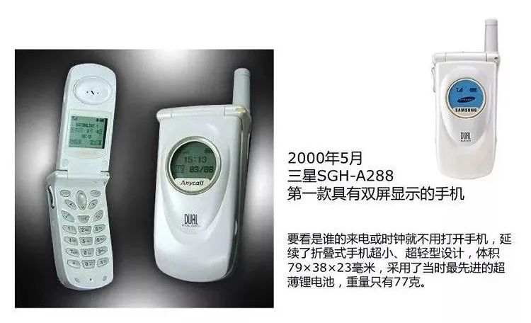 和摩托罗拉一样,三星也在功能机时代早早积累技术经验,在千禧年,它带来第一款具有双屏显示的手机 —— 三星 SGH-A288,这款手机小巧,轻便,还能不打开手机直接查看时钟和来电。诶,这些功能是不是和现在部分带有外屏手机的功能如出一辙?
