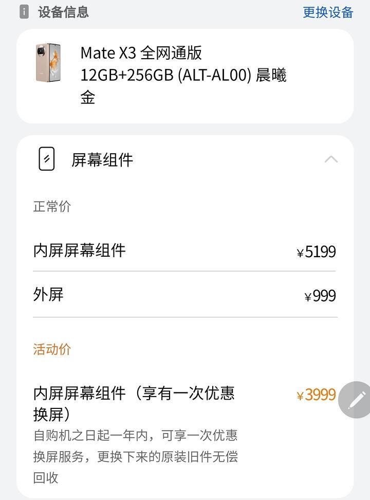 华为 Mate X3 的内屏 5199 元,外屏 999 元。