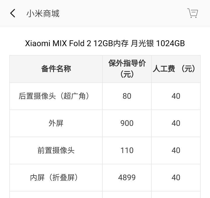 上代 MIX Fold 2 的内屏为 4139 元,外屏 660 元。