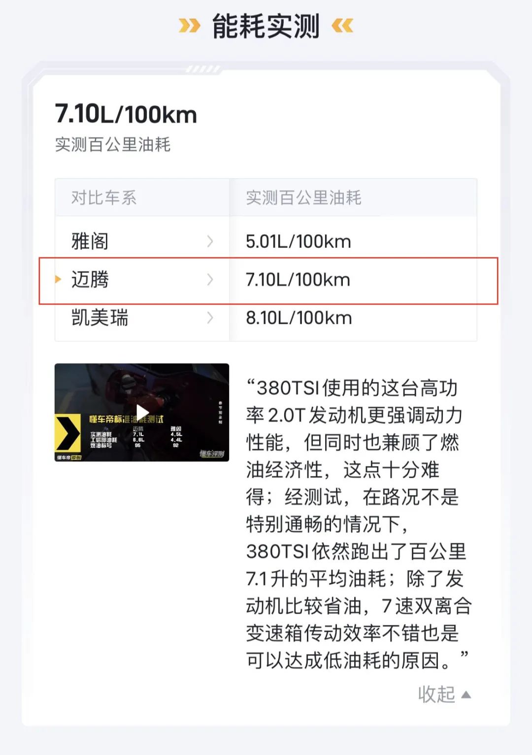 目前 92 号汽油的价格为每升 8.08 元,按照懂车帝 App 上的数据,迈腾每百公里综合油耗是 7.10L,也就是每百公里油耗成本是 57.37 元;