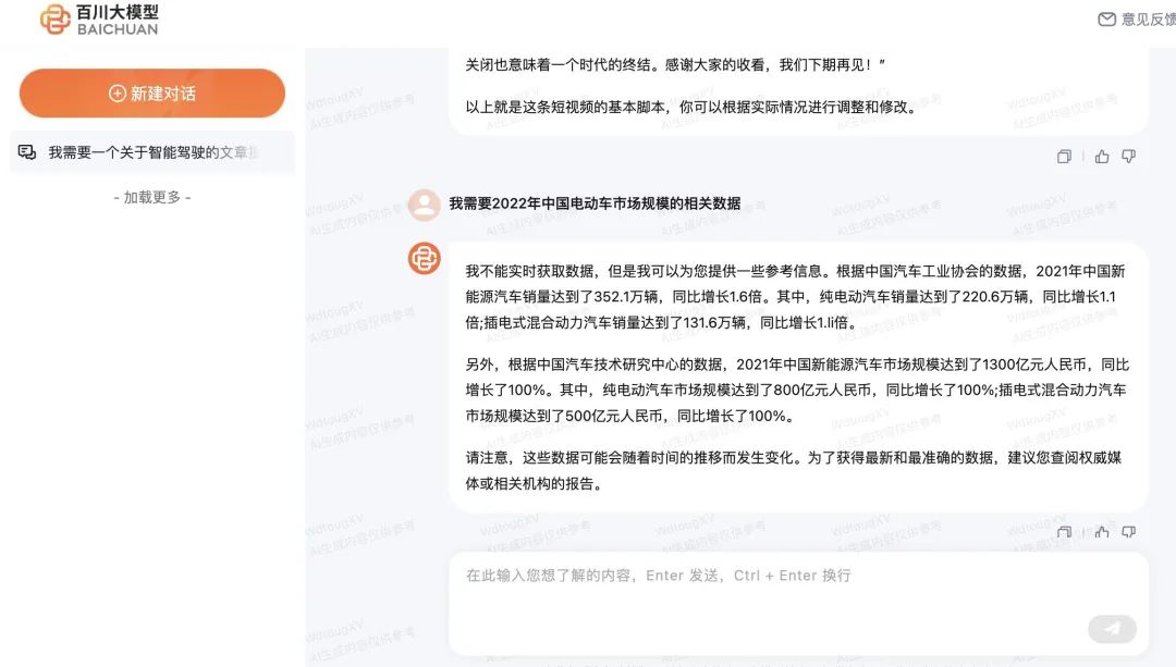 简单的提纲撰写完成,还需要考验产品们的创意创作能力。我告诉它们,刺猬公社希望开辟一个新能源车领域的新板块,需要一个名字以及100字的简介。模型们都完成了任务,百川大模型的名字比较诗意:“驭风者”,并且强调“寓意着我们在新能源汽车领域中驾驭着时代的潮流”。