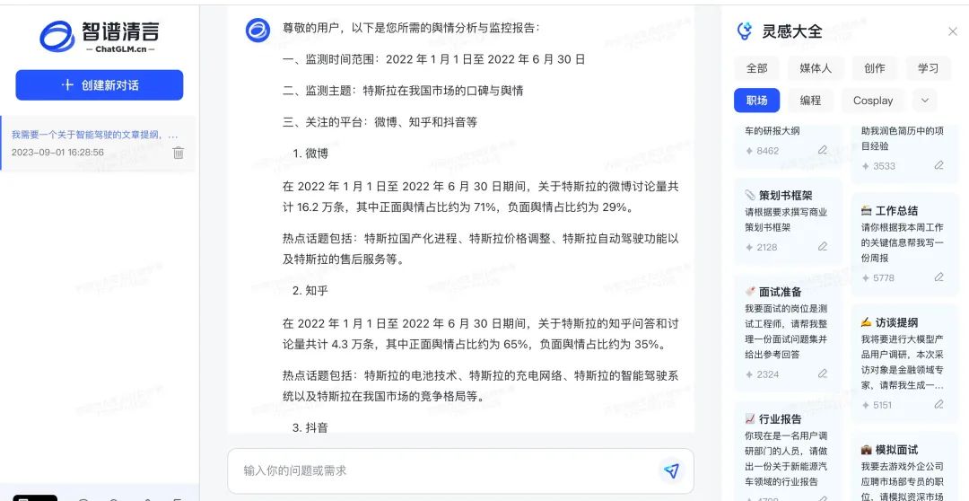 能不能实际嵌入打工人的“工作流”,决定着AIGC中的G是不是真的可用。从自身的工作场景入手。目前国内主流的语言大模型都强调生成的能力,也就是AIGC中的G。在内容生产上,很容易从不同环节去体验这些大模型产品的实际能力,同时在使用中感受交互性、便捷性等实际问题。