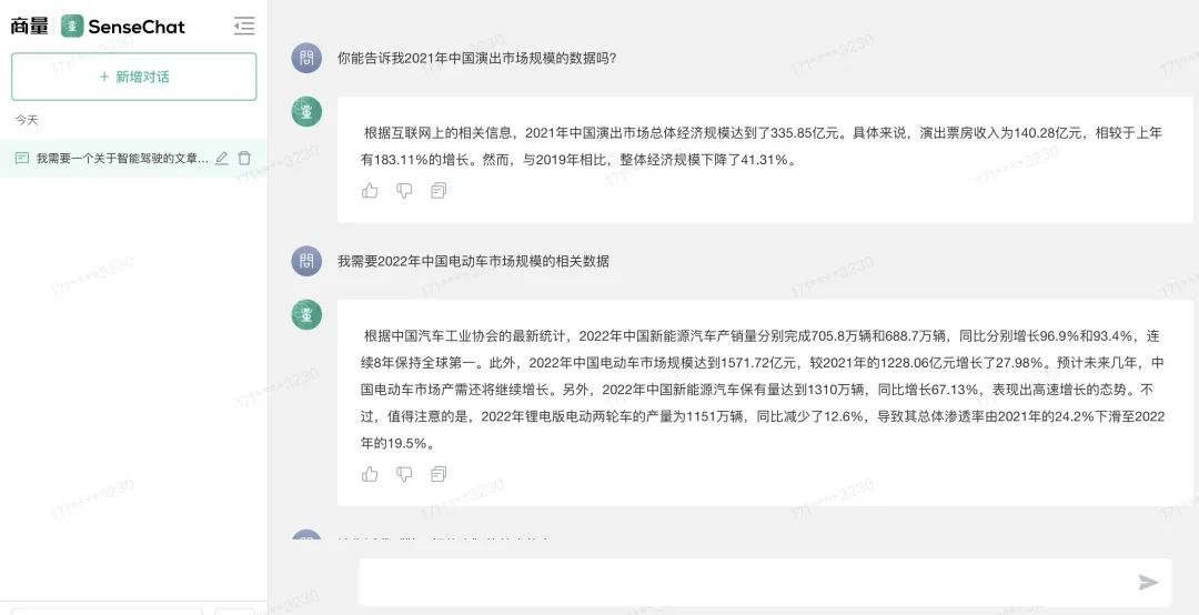 我以“2021年中国演出市场规模”“2022年中国电动车市场规模”为题对七款产品进行了提问,文心一言、豆包、商量SenceChat、讯飞星火的发挥比较稳定,成功给出了正确的数据,其中豆包、商量SenceChat回答的较为全面,两个问题都给出了产业规模,还给出了品类数据,同比增长数据等信息,文心一言、讯飞星火则更简洁,但给出的答案比较清晰。