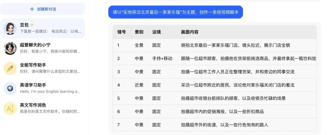 在更专业的文本创作、例如视频脚本的场景下,面对“探访北京最后一家家乐福”短视频脚本撰写任务,大模型们都给出了不错的答案,镜头、文案、画面都颇有想法,从“最后一家家乐福”这一点出发,给出了不少情怀满满的文案。表现比较惊艳的是豆包,短视频毕竟是字节的优势内容,它直接给出了一个详细表格,包含景别、运镜、时间、画面、旁白等一系列内容,甚至直接帮我挑选了配乐。不过,《We are the Champions》似乎并不太符合这个略显伤感的主题。